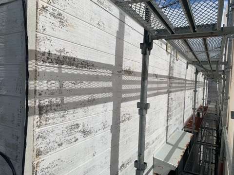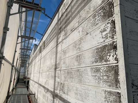 写真は施工前状況ですが、劣化具合が非常に進んでおり、旧塗膜の剥がれがあちこちに見受けられますが、バッチリ仕上げていきます。