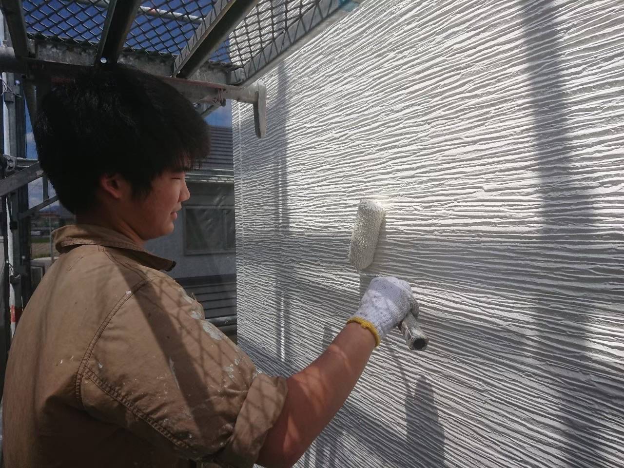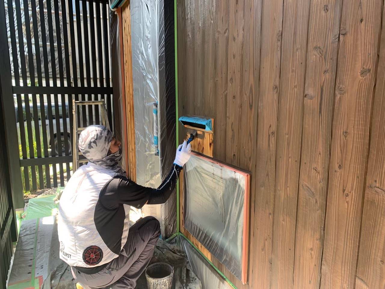 サイディング壁の下塗りはプレマテックスのシリコン浸透シーラーEXを使用、木部壁は和信化学工業のガードラックラテックスを使用しており、環境対応型となっております。