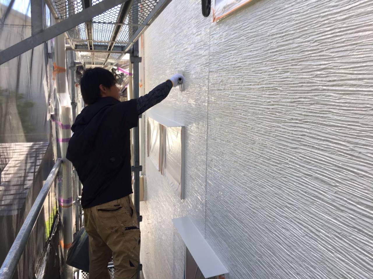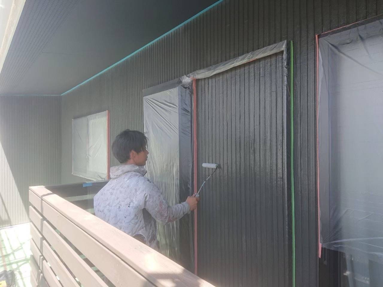 外壁の北面のカビやコケに悩まれていた御宅ですので、通常の下塗り、中塗り、上塗りの3工程の上から光触媒Cutalyst外壁用を塗布していきます。
