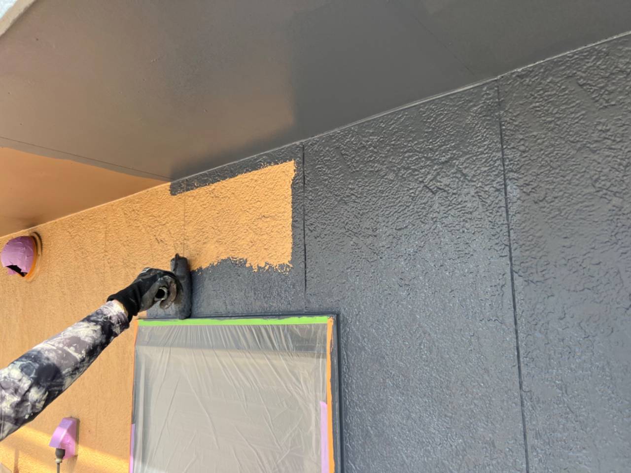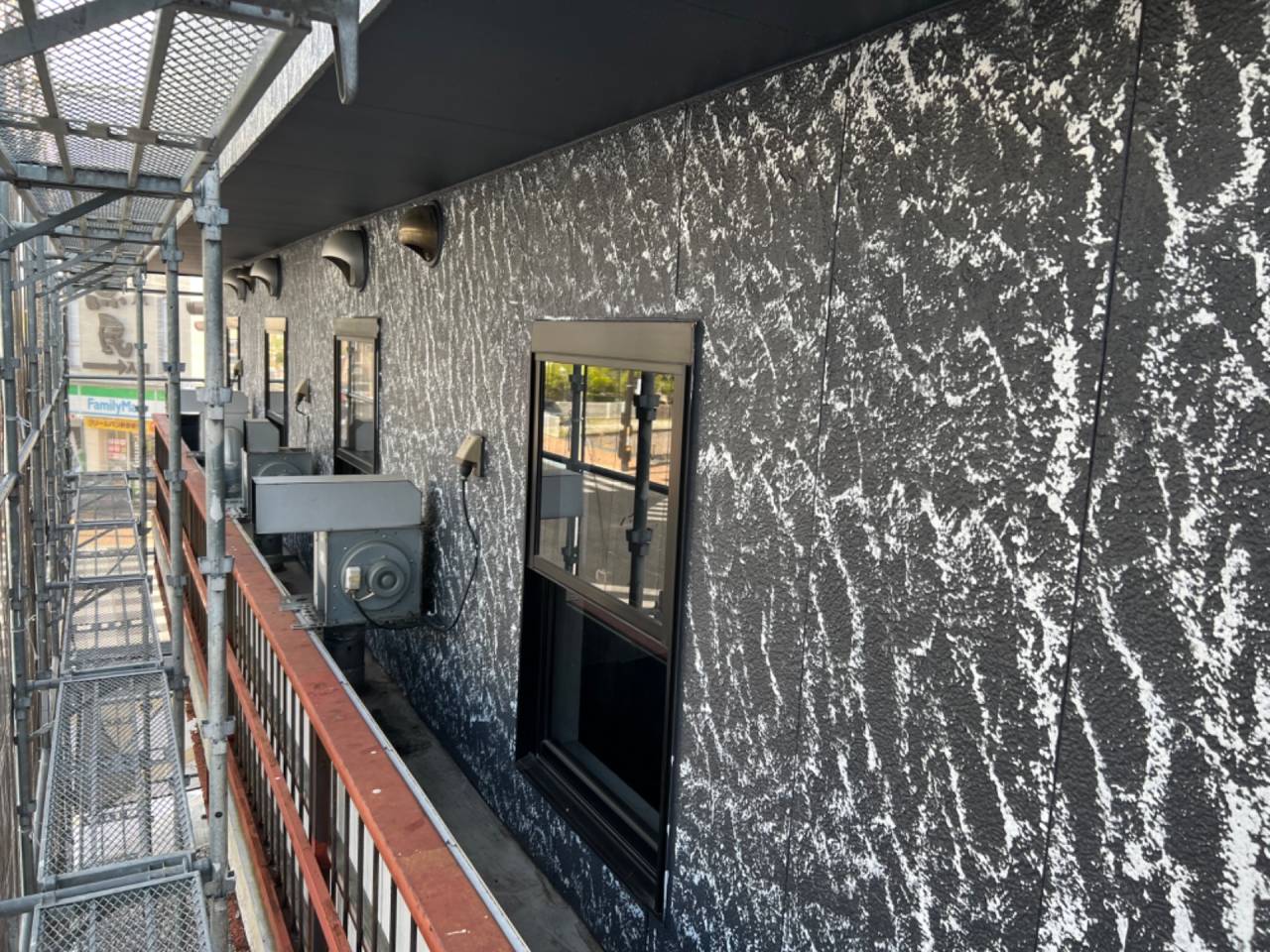 今回は佐賀駅北口前の焼肉かくら様の多彩模様付け塗装の状況をお伝えします。