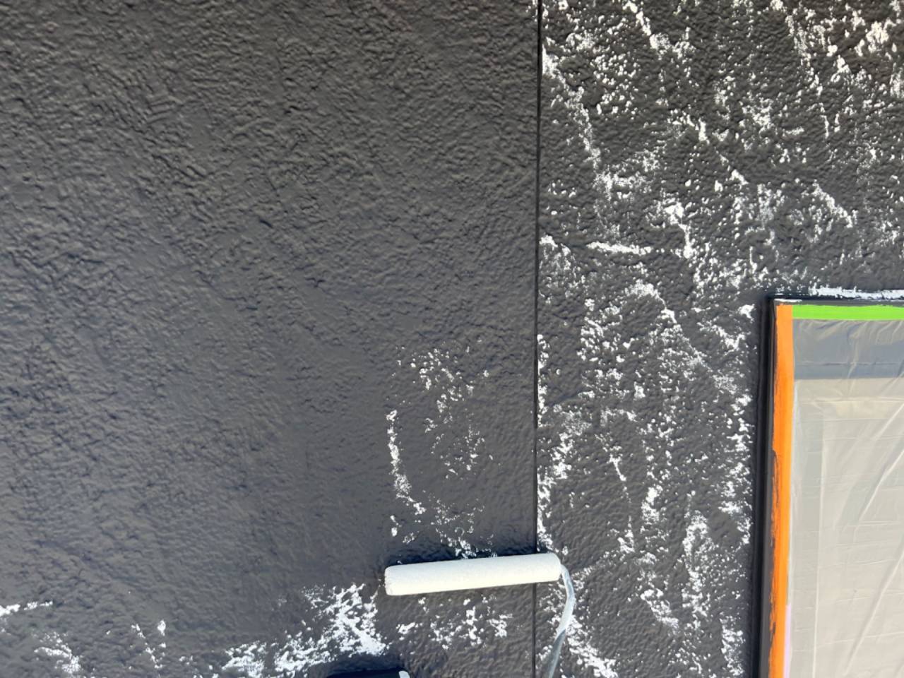 中塗りで一度真っ黒に染めた後、短毛ローラーにて凹凸を利用して白色の塗料をランダムに塗っていき、模様を付けていきます。