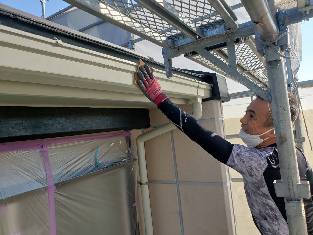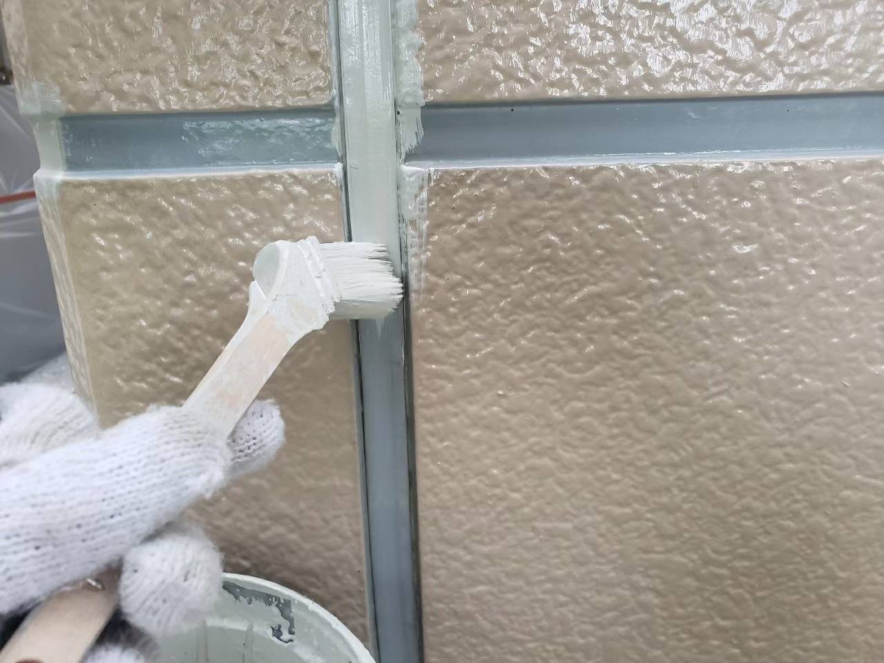それと外壁の目地にシーリングが無い代わりにガスケット等と呼ばれる目地に嵌め込む部材がございますので、それにブリードオフプライマーという汚染防止、密着力強化のためのプライマーを塗装していきます。