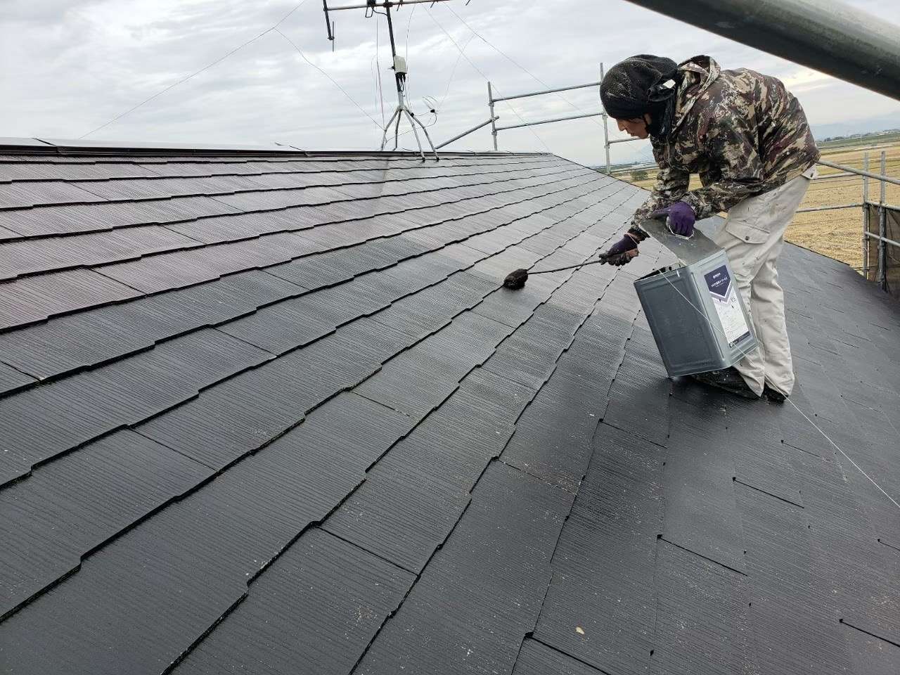 シリコン樹脂仕様で使っている材料は下塗り材がエスケーのマイルドシーラーEPO、中塗り上塗り材がプレミアムルーフシリコンのブラック色となっております。
