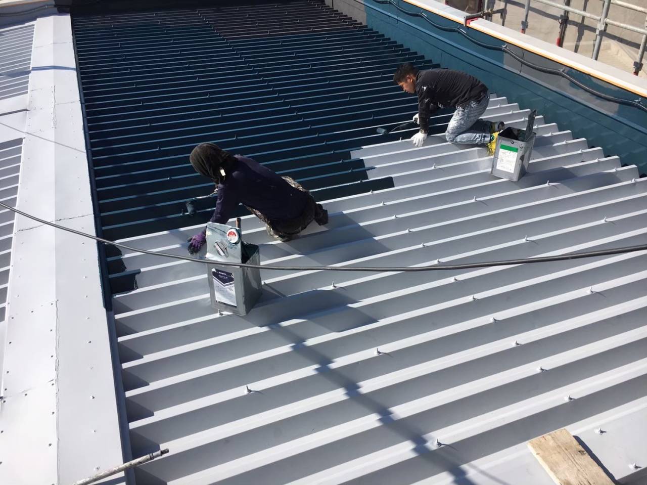 更に、中塗りと上塗りの色を変えて塗装することにより、塗り残しのないように2人1組で塗装していきます。