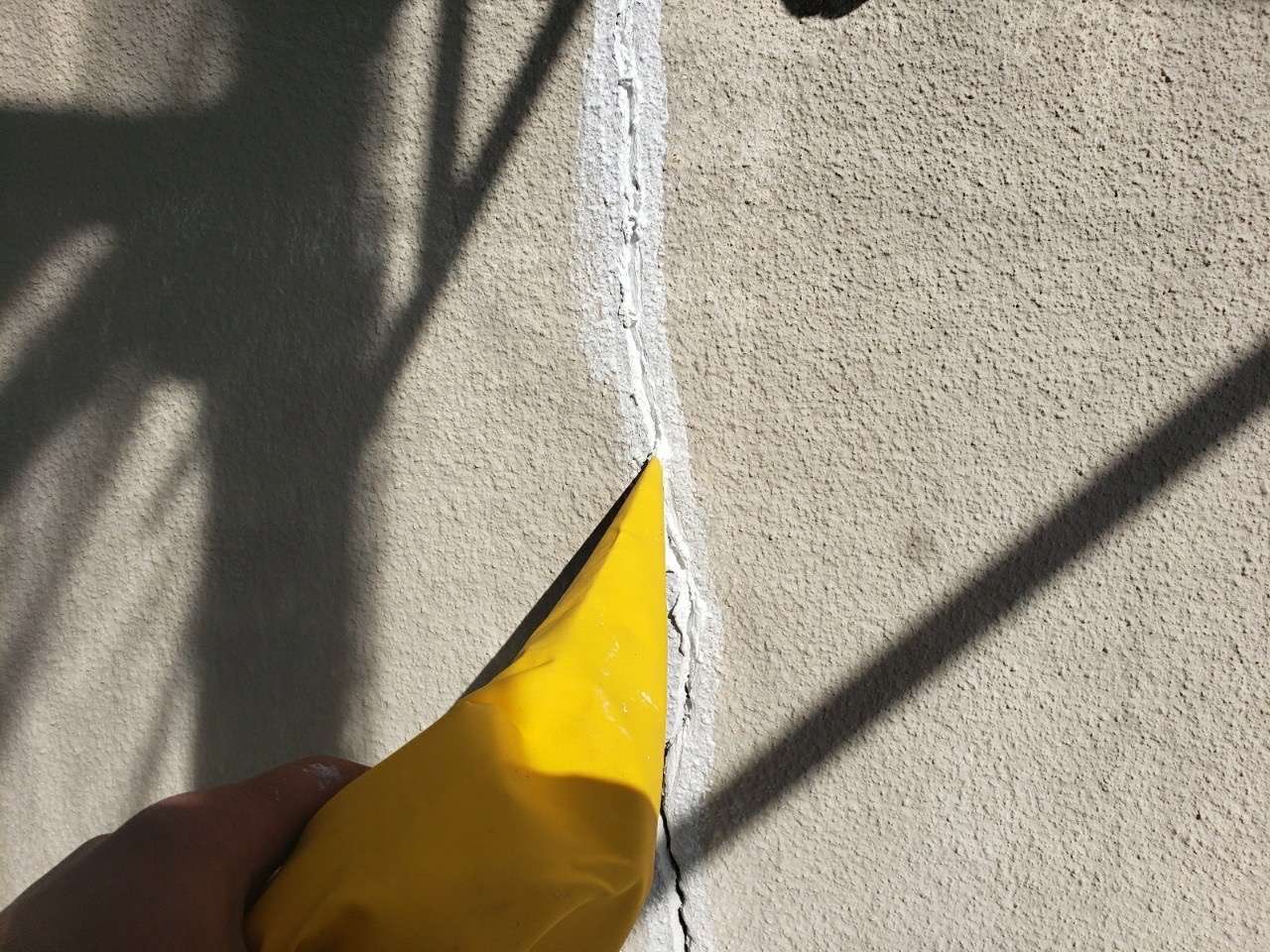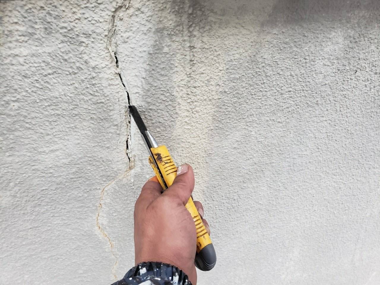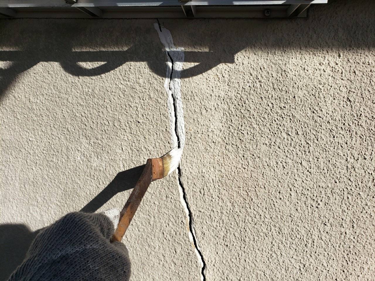 こちらの御宅はモルタル壁でひび割れの酷い箇所があったため高圧洗浄前にクラック処理を行います。