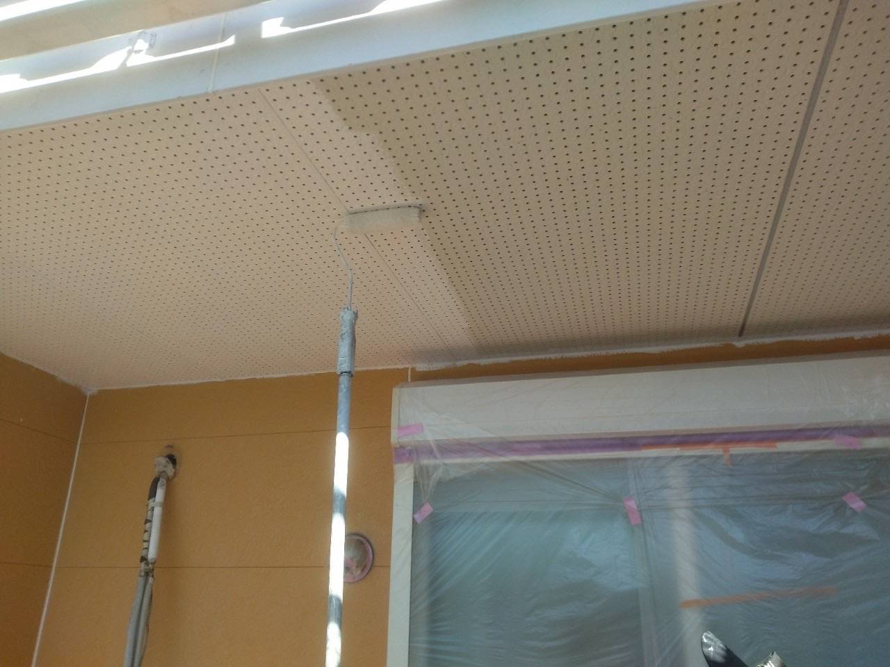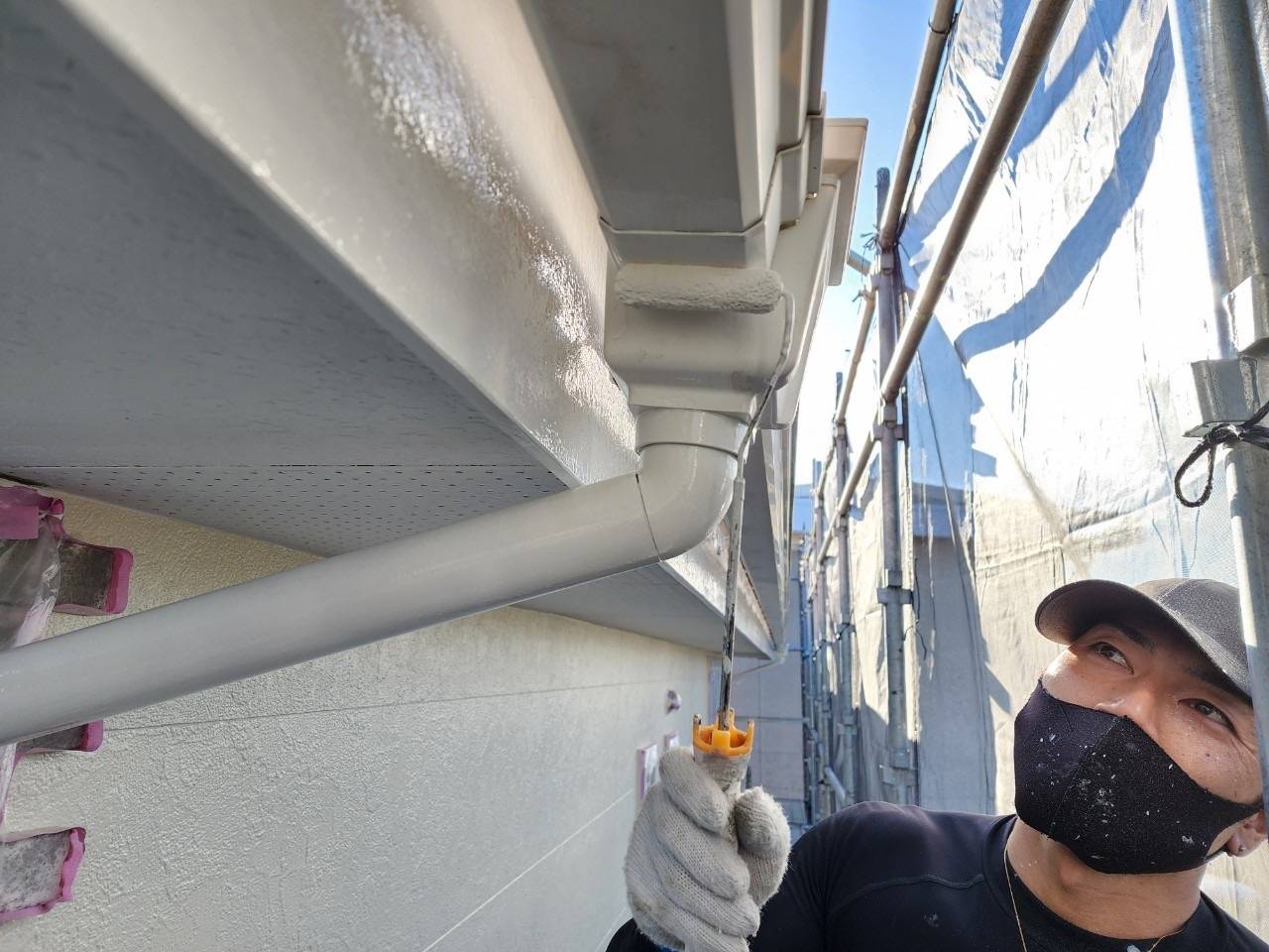 破風や、樋にはニッペのファインパーフェクトシーラーを、シャッターボックスや水切り等の金属部には同じくニッペのファインパーフェクトプライマーを用途によって使い分けて塗布していきます。