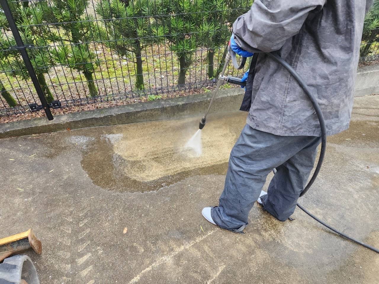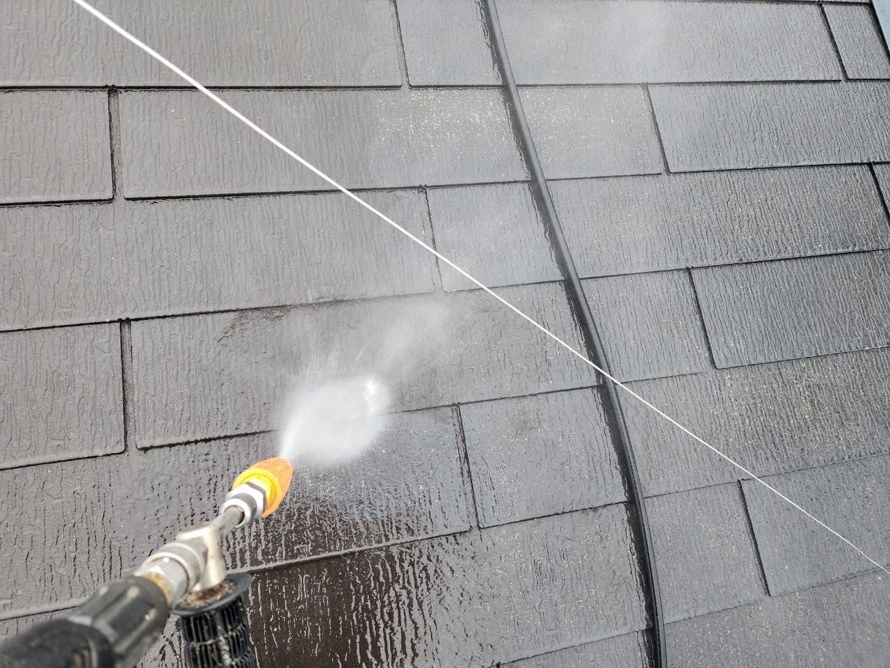 平屋造りですので、東西面のみ足場組み立てを行い、高圧洗浄を手掛けていきます。