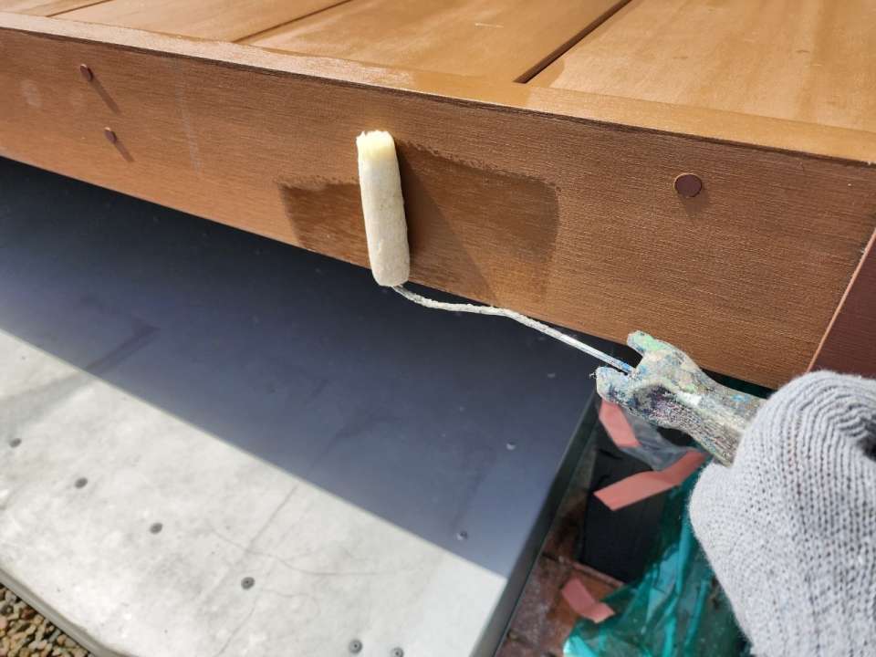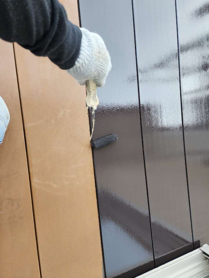 下塗りにプレマテックスの無機有機ハイブリッドEPOを塗装し、中塗り、上塗りにプレマテックスのタテイルαプレマエディションのカカオブラウン色を塗装していきます。