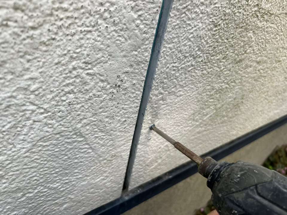 まずはサイディング外壁の割れや浮きをビスを電動工具で打ち込んで修繕していきます。