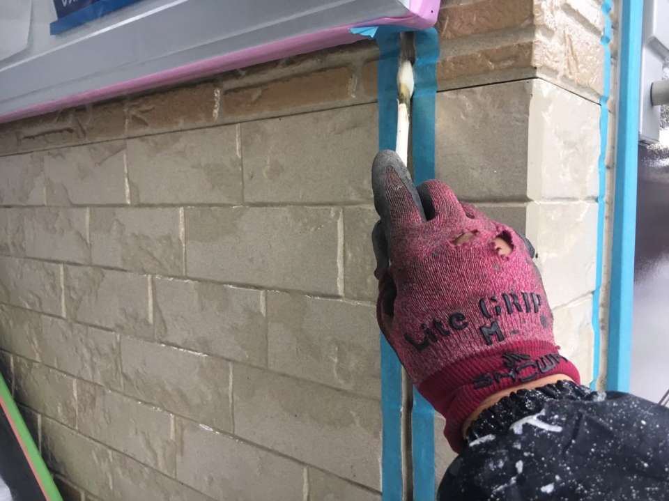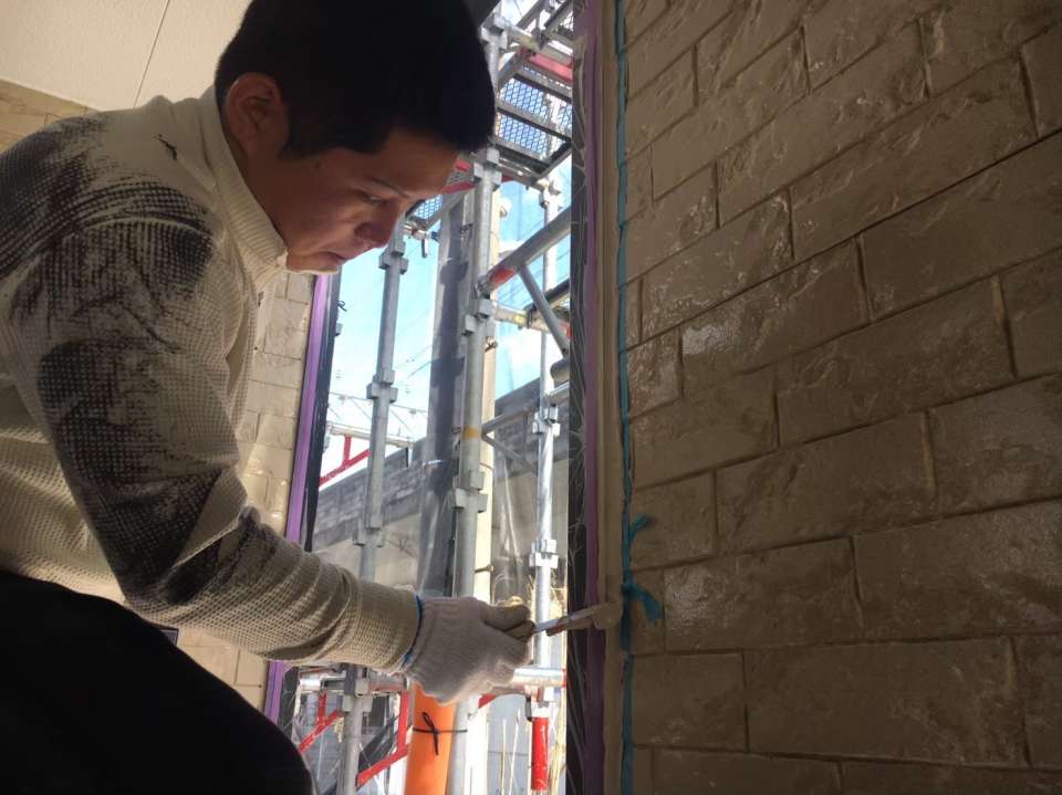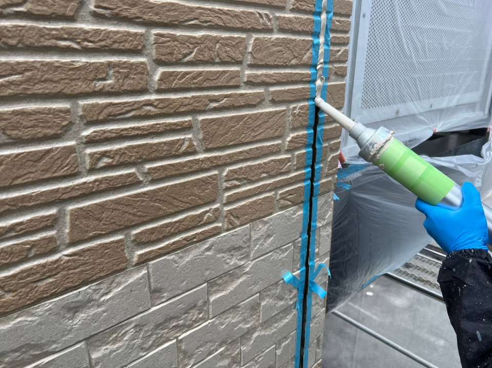既存シーリングを撤去後、オートンシールプライマーを塗布してから外壁色に合わせた色のシーリングを打ち込んでいき、ヘラで押さえて仕上げていきます。