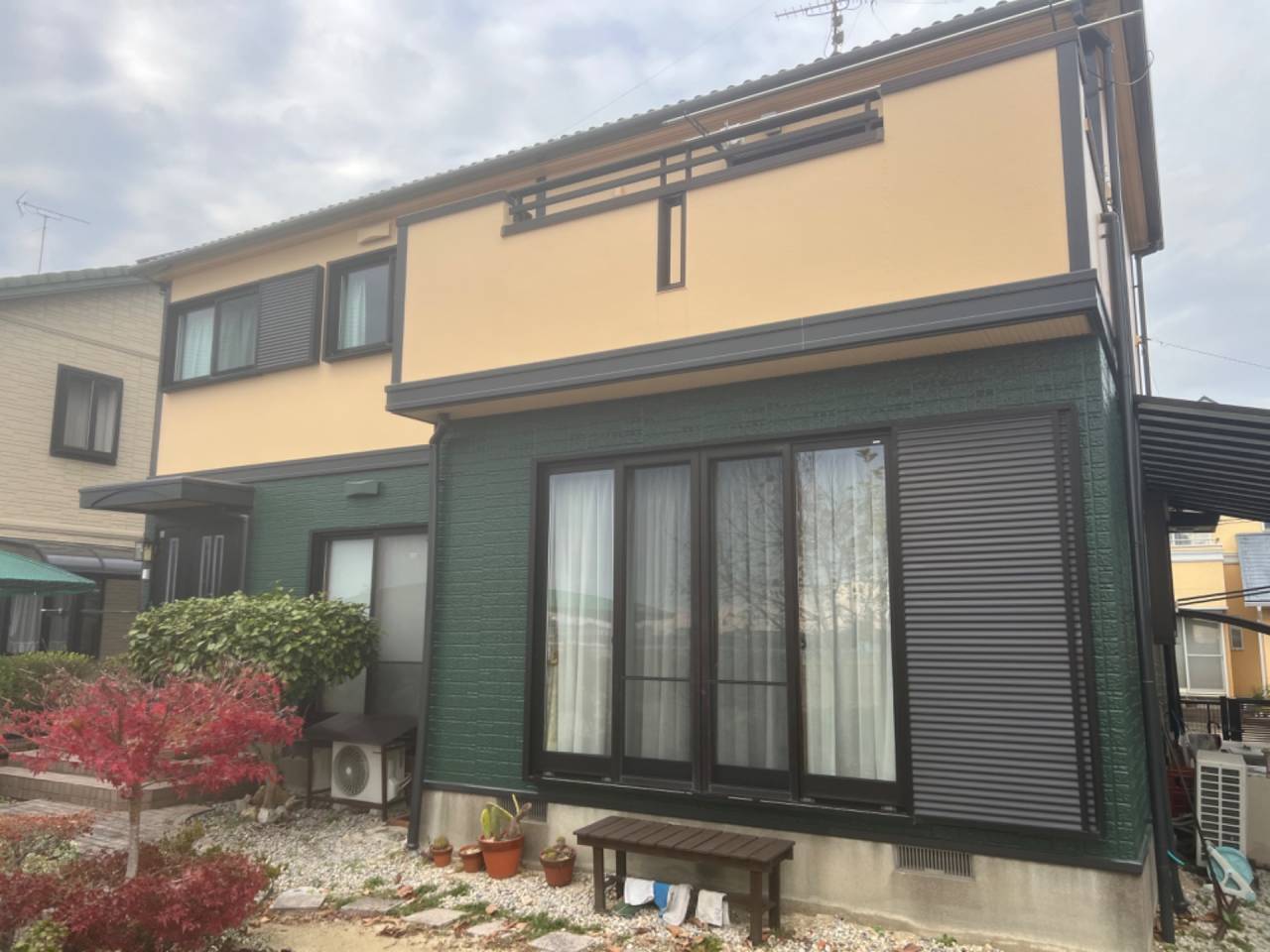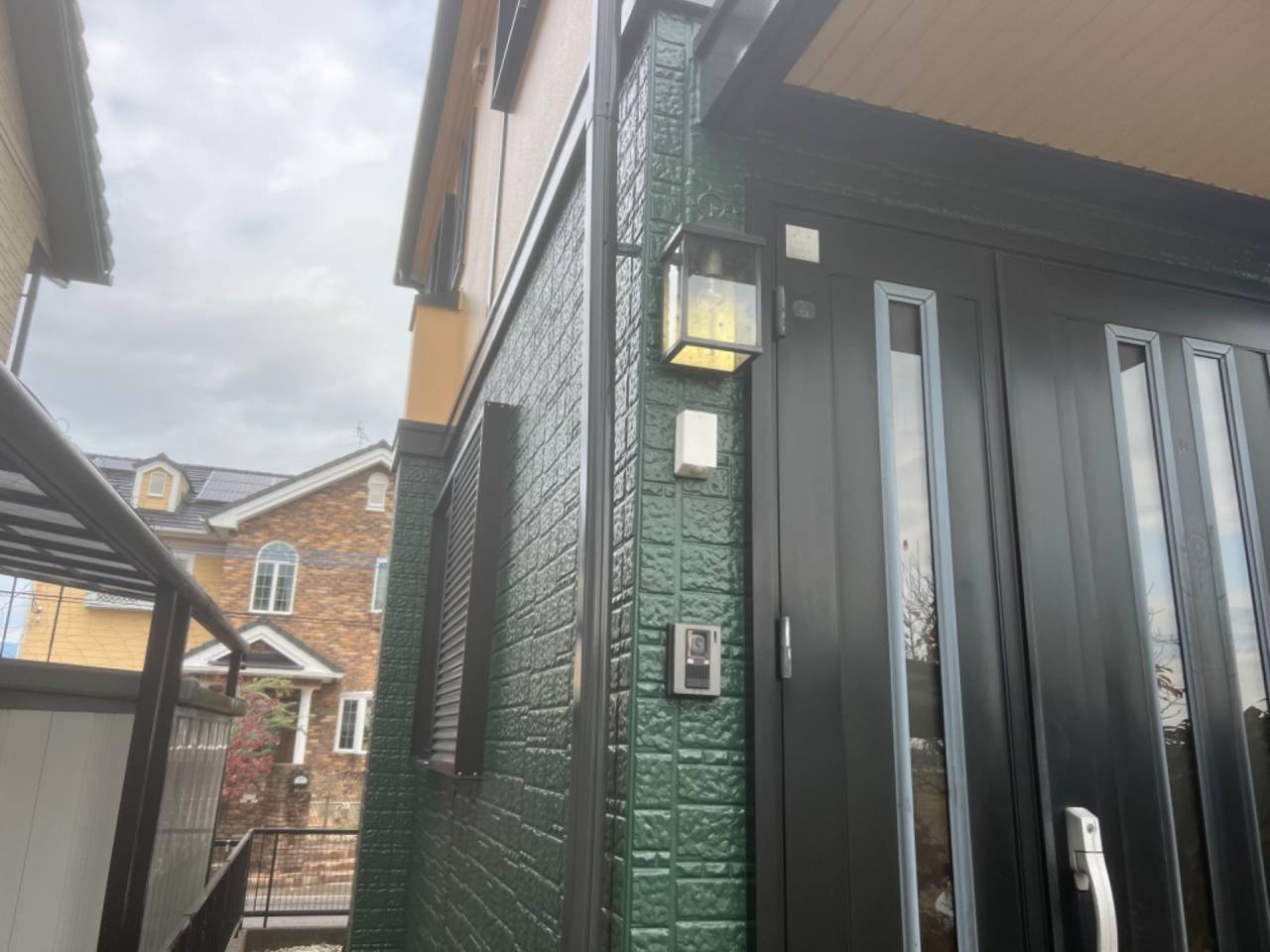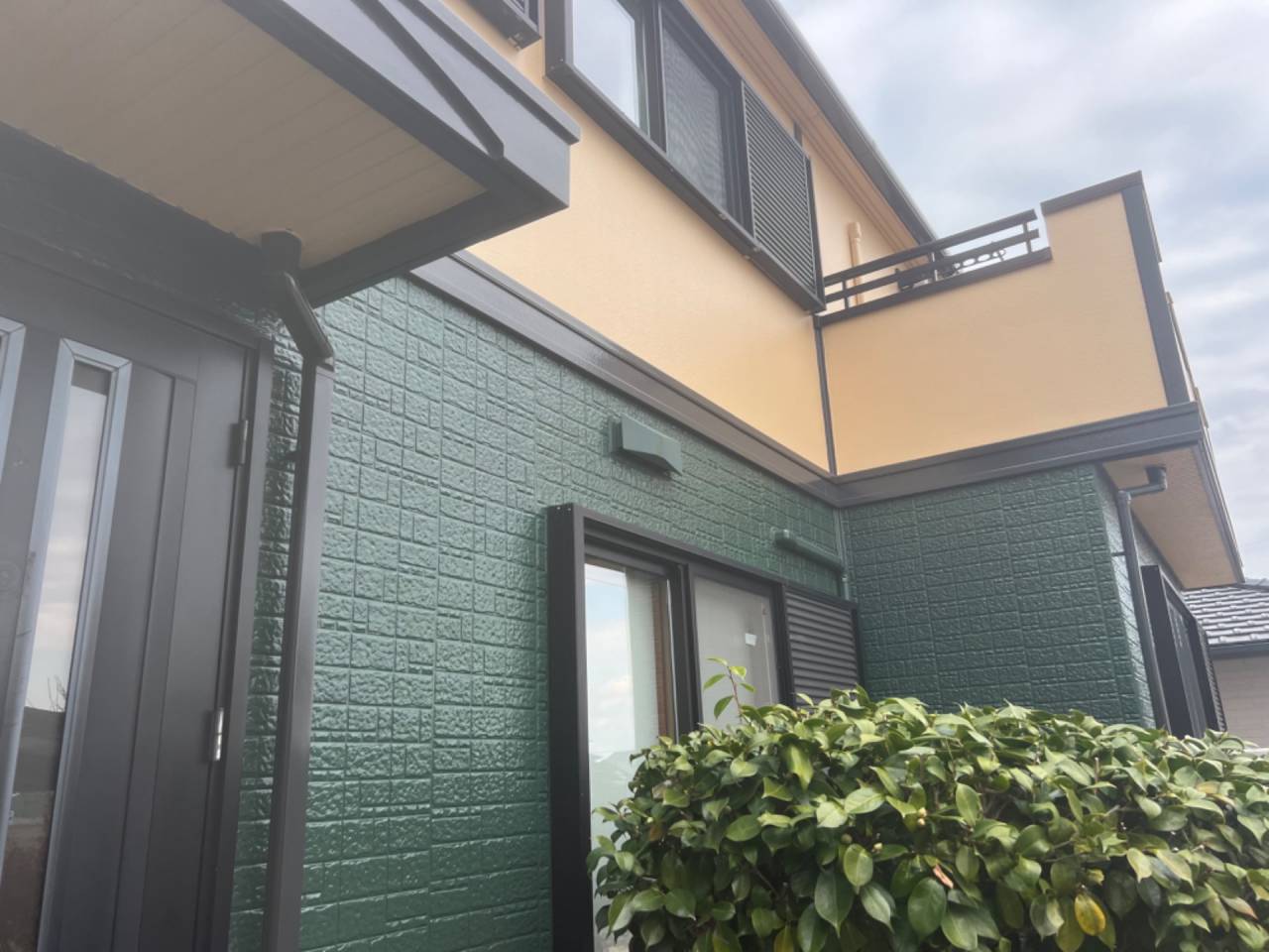 外壁塗装のツートーンはサンダルウッド色とボタニック色という薄いオレンジ系と濃いめのグリーンの2色を使い分けて塗装しております。