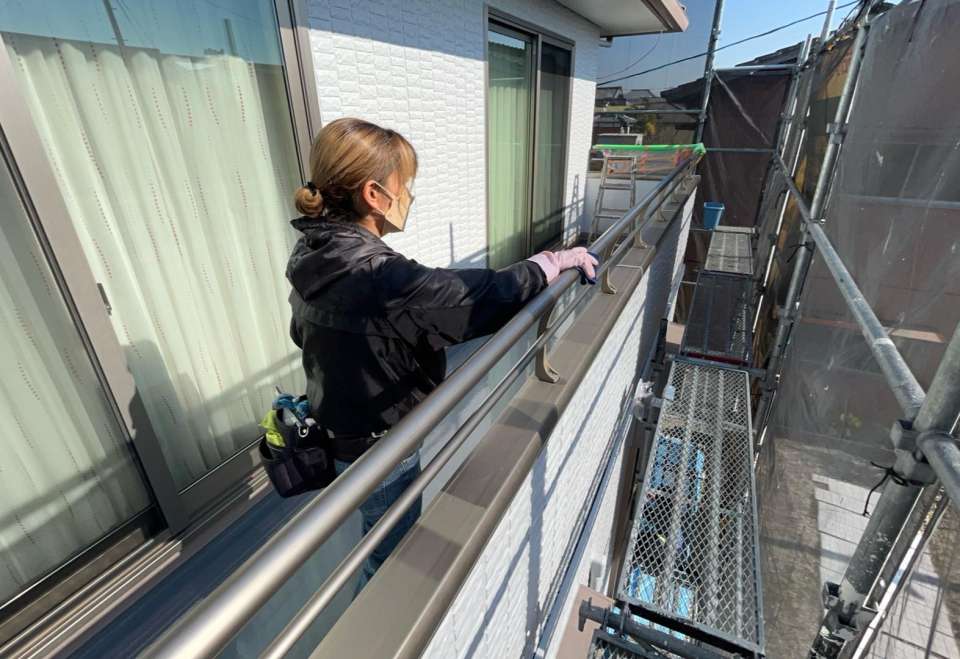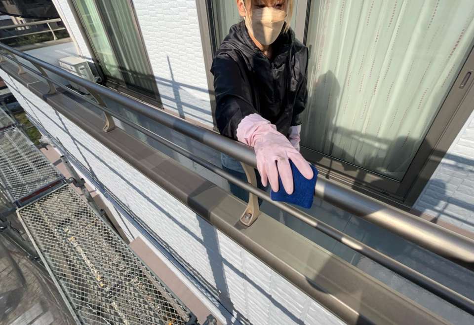外部清掃は汚れが酷いので特に手すりを入念に清掃していきます。