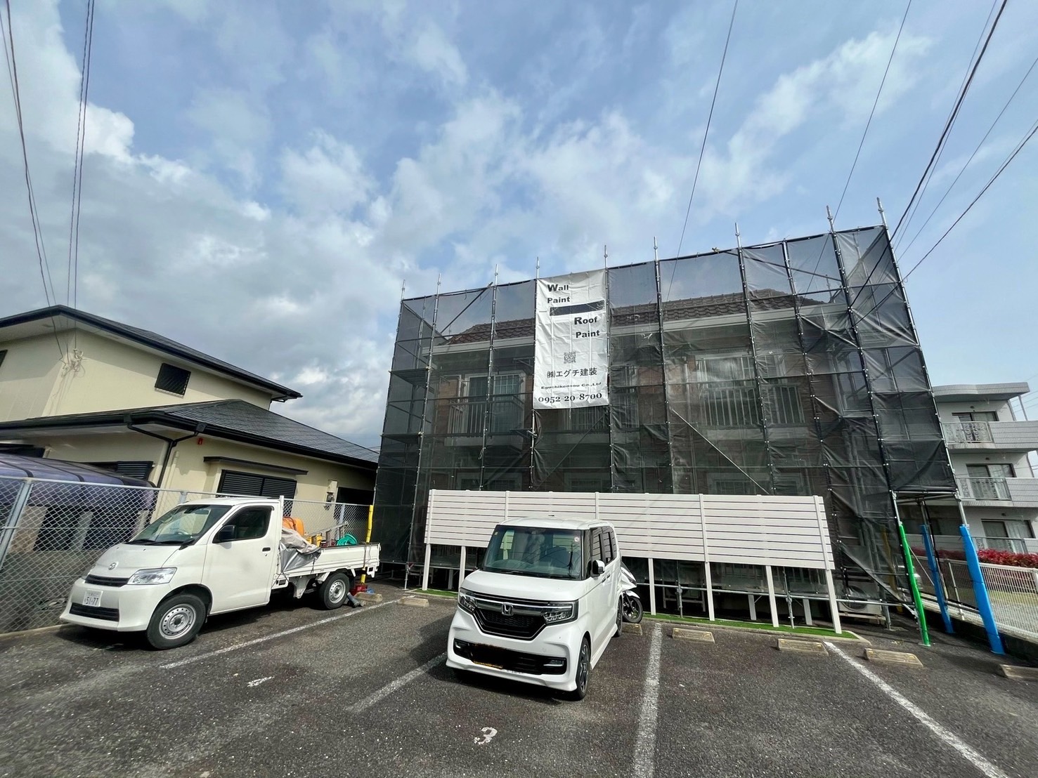 エグチ建装では、足場をしっかりと設置して、安心して塗装工事を進めていきます。