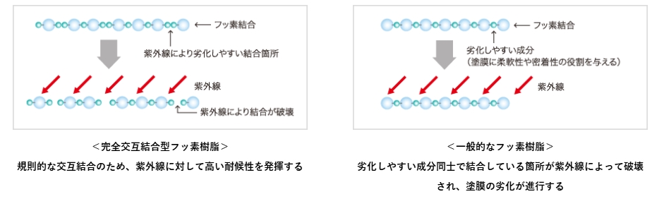 しかし一般的なフッ素樹脂は、劣化しやすい成分同士で結合している「交互性の低い箇所」があり、その箇所が紫外線に破壊されることで塗面の劣化が進行します。