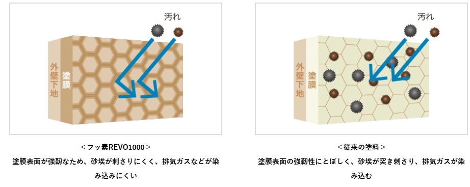 フッ素REVO1000は、塗膜の表面が強靭なため、砂埃が突き刺さりにくく、排気ガスなどが染み込みにくいのが特長です。