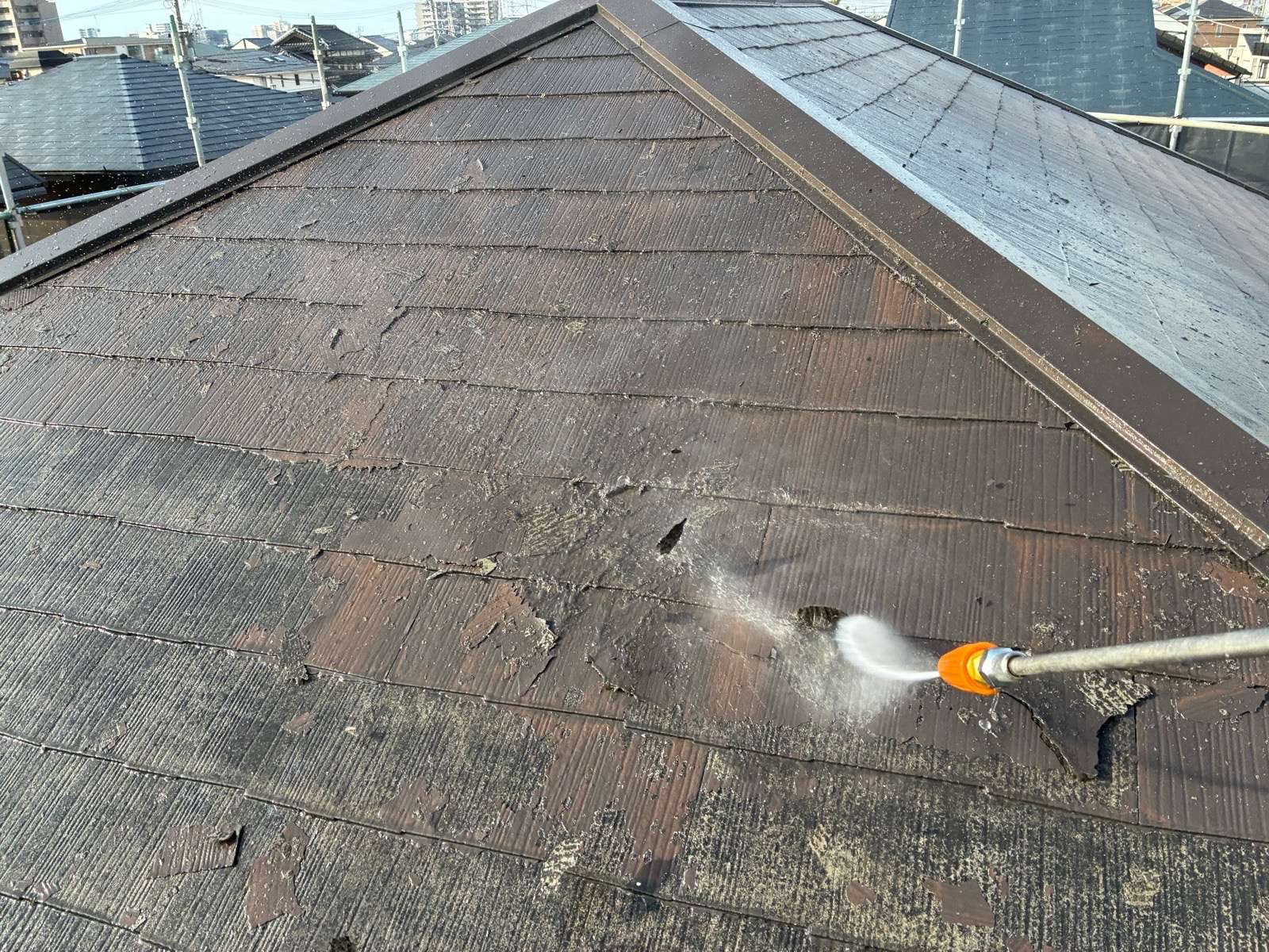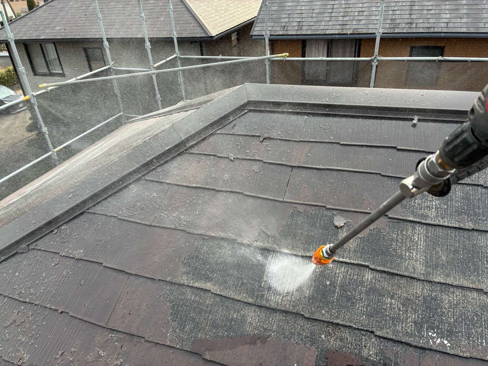 塗装工事の最初に行う重要な下地処理で、外壁や屋根に付着した 汚れコケ・カビ 旧塗膜の粉(チョーキング)などを高圧の水で洗い流す作業です。