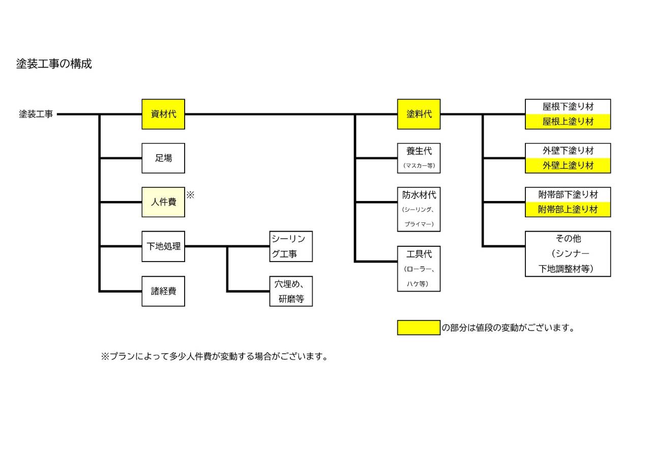 図のように塗装工事と一言に申しましても様々な要素で構成されております。黄色の部分が値段の変動がある箇所なのですが、この部分の違いがプランの違いになってきます。