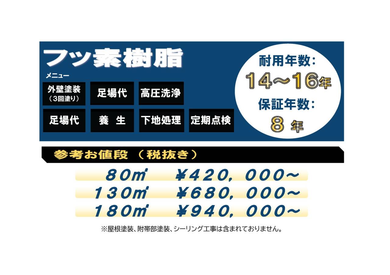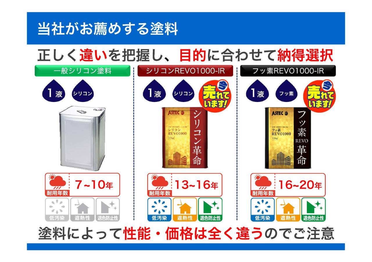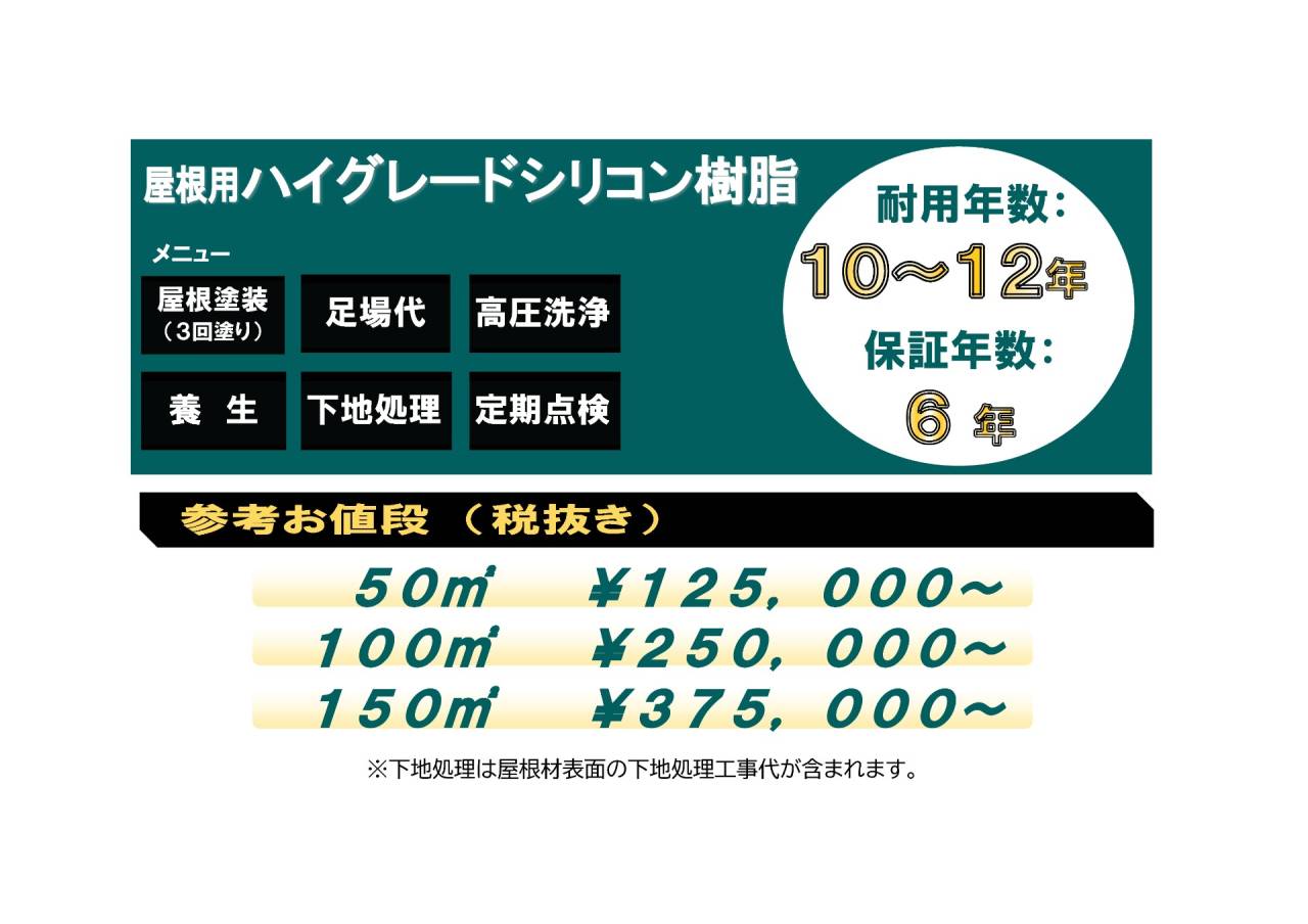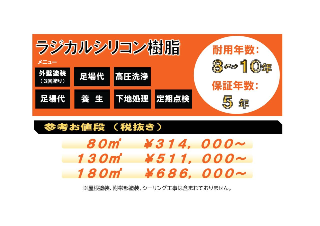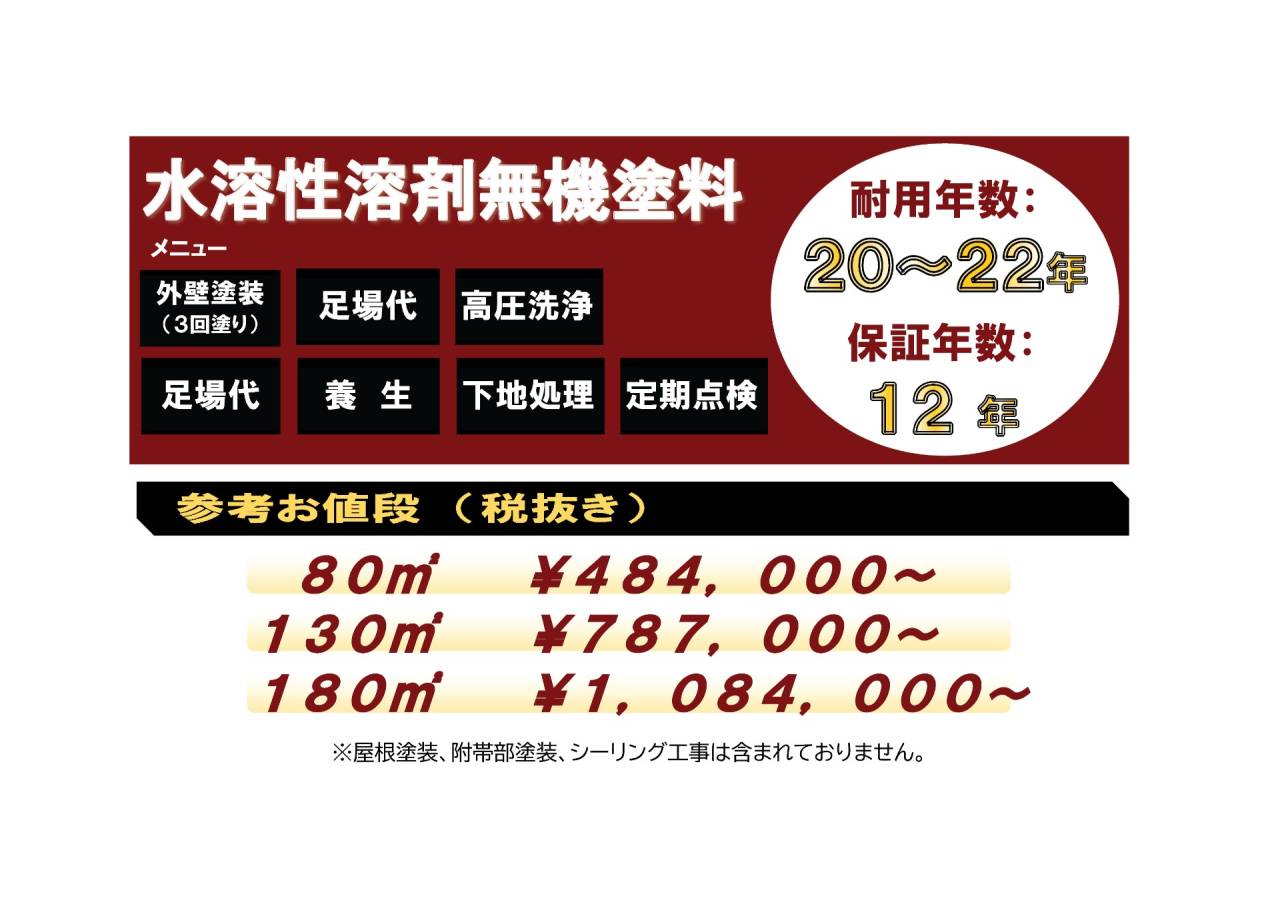 外壁、屋根の塗装以外に 『遮熱塗装 と 断熱塗装』、 『防水工事』 の金額を掲載しておりますので、こちらも参考にされてください。