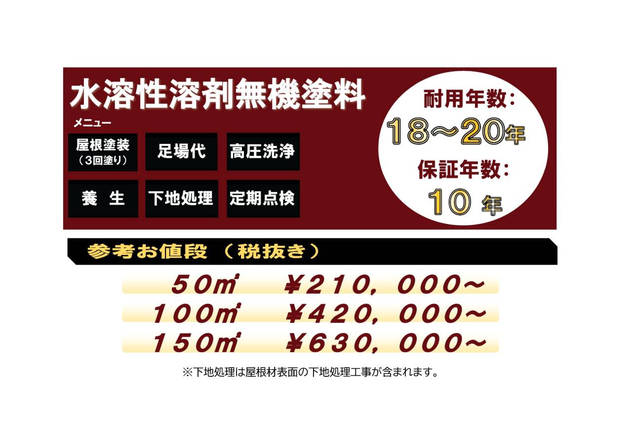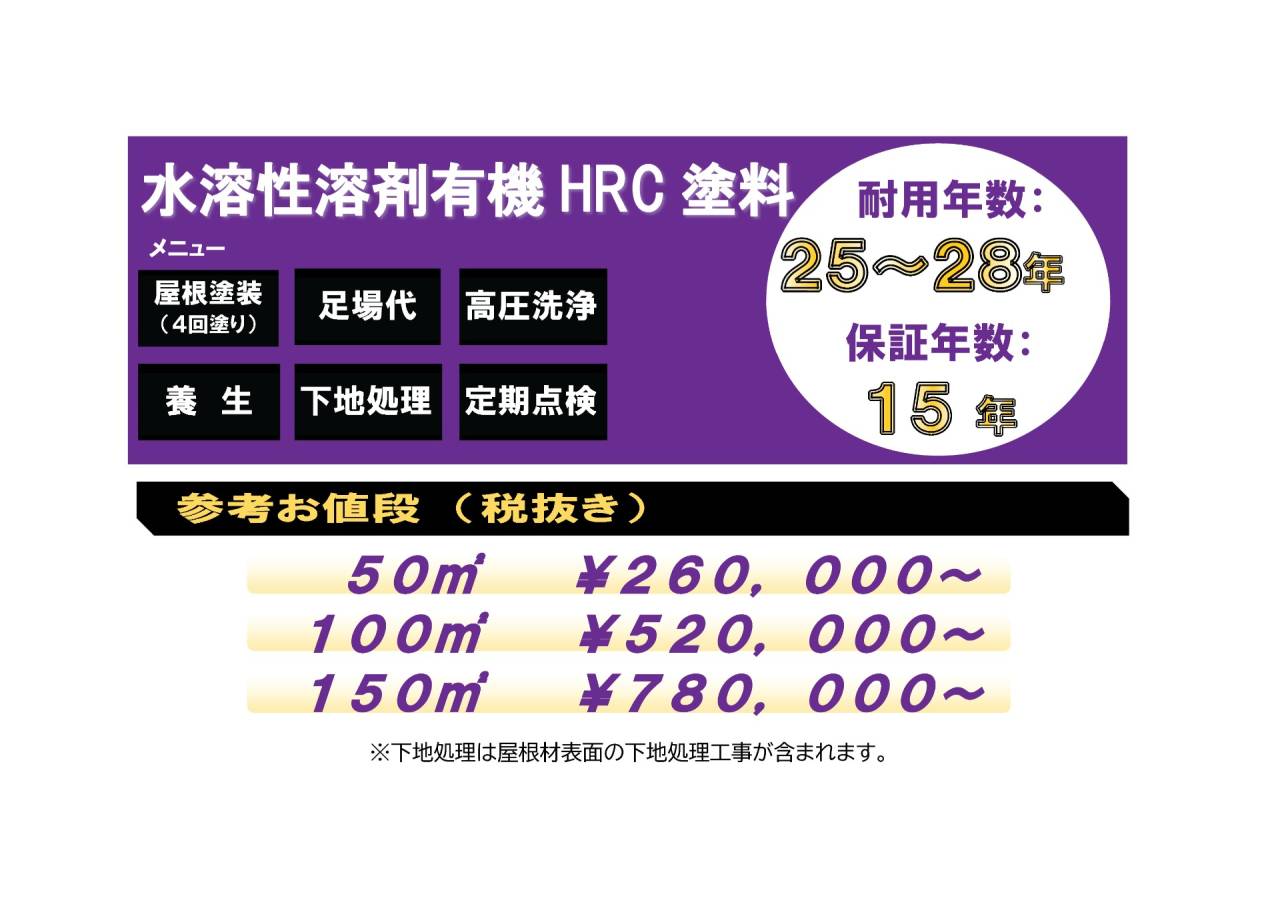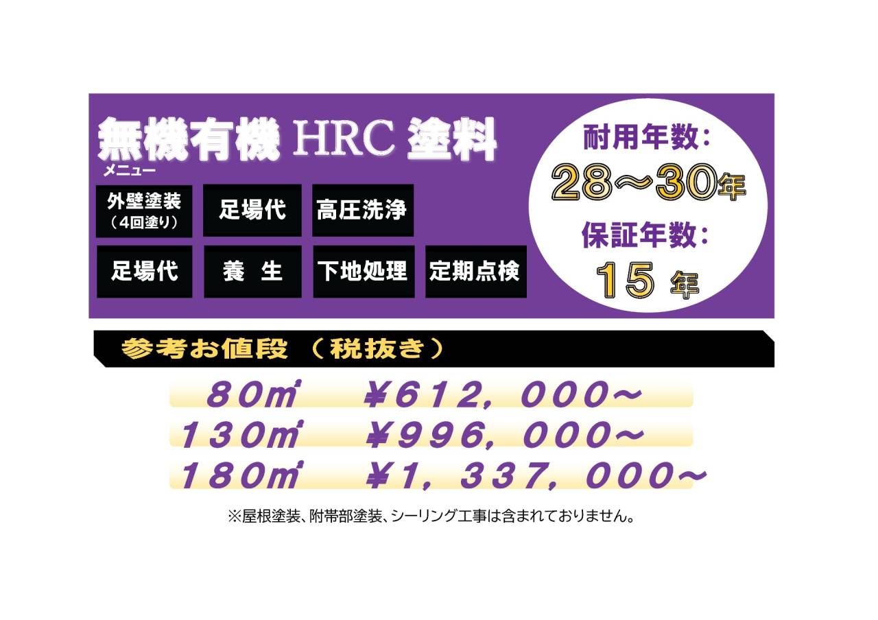※無機有機HRC塗装を施して15年もの保証を発行するためには下地の状態が良く、立地条件等も関わってきます。現地調査後に想定よりご提案価格が上がったり、この仕様での塗装ができない、15年の保証がお出しできない場合が稀にございますことをご了承ください。