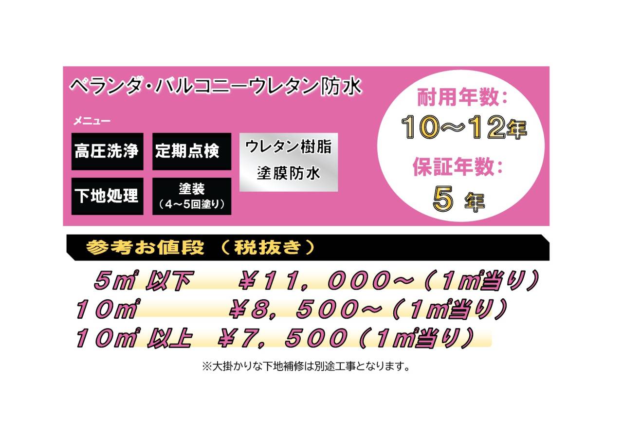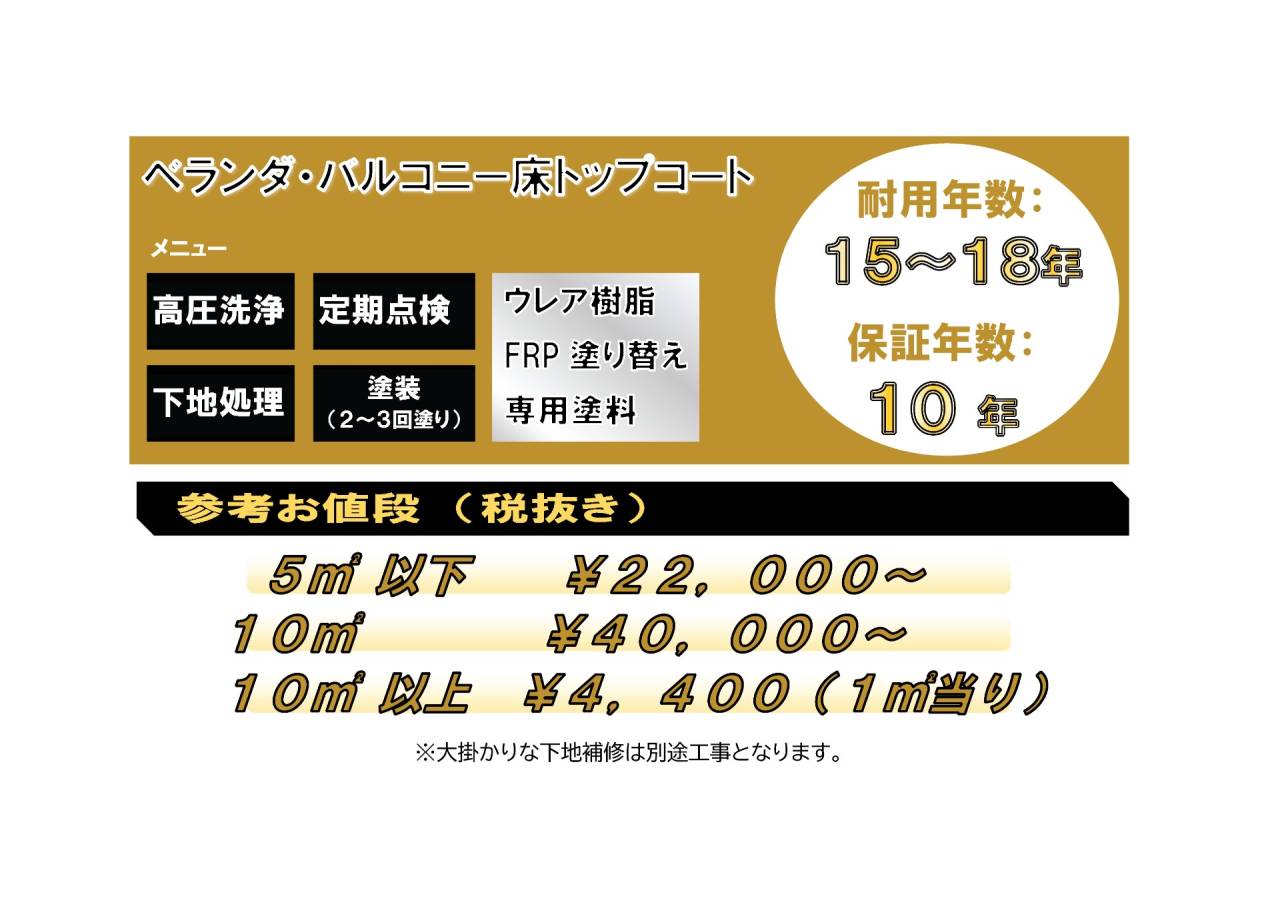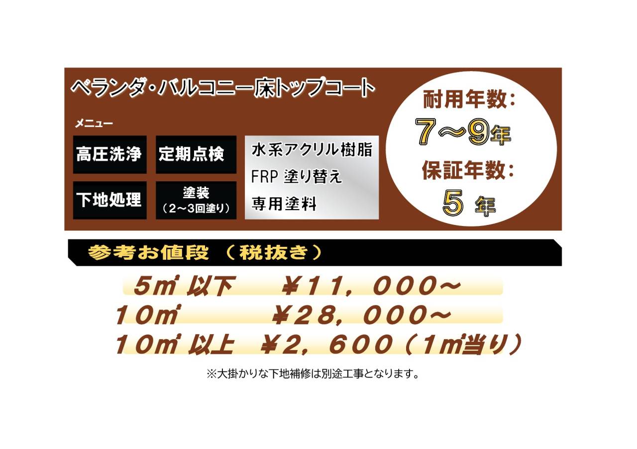 ※住宅のバルコニーやベランダを考慮した金額です。面積が大きい場合、単価は下がる可能性がございます。