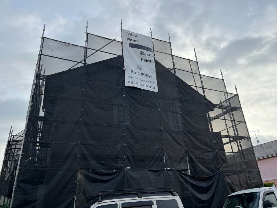 皆様こんにちは。今回は伊万里市にある某取引会社様の伊万里営業所の事務所塗装工事状況をお伝えしていきます。まずは下地処理の研磨と高圧洗浄の状況です。